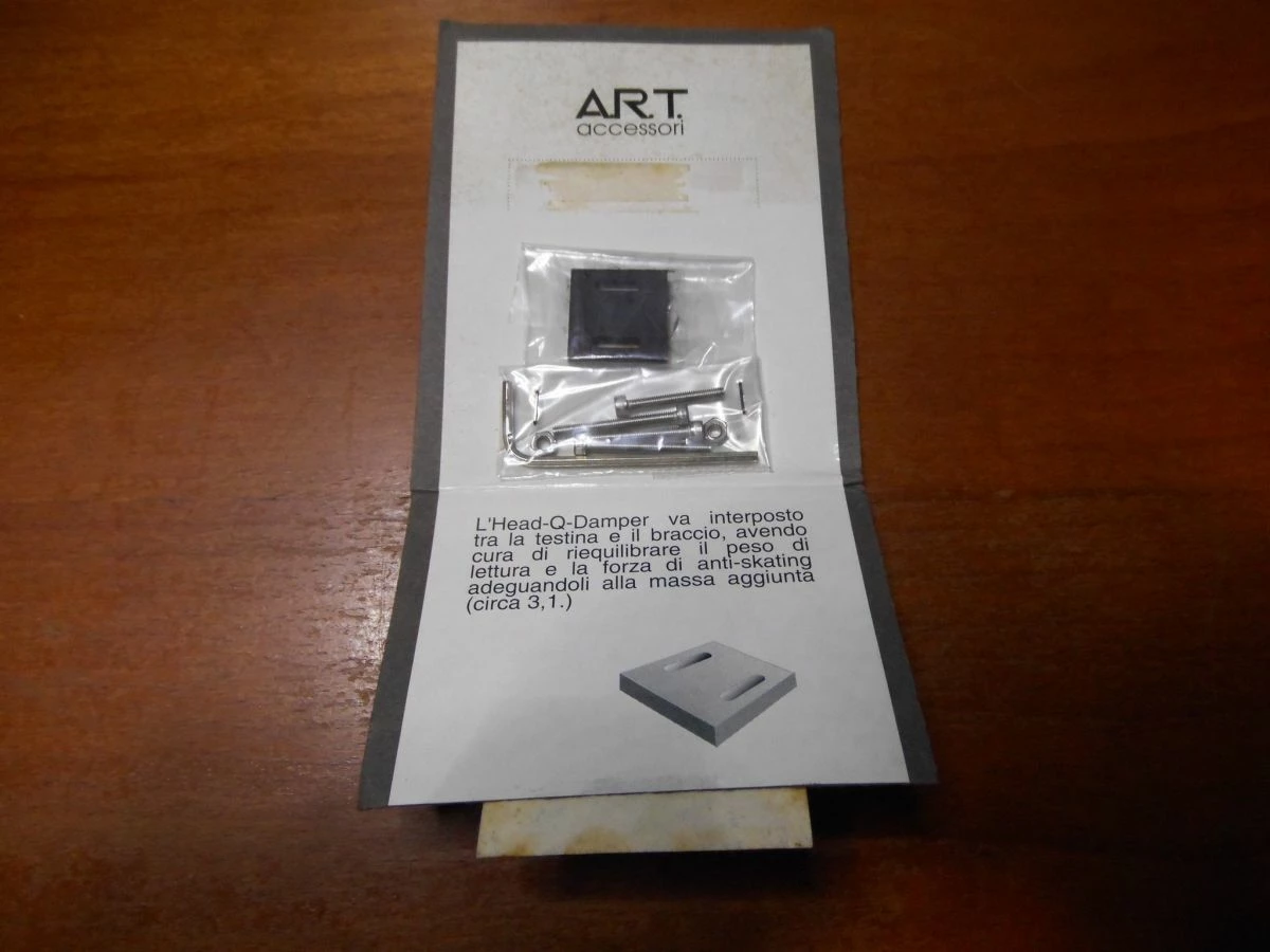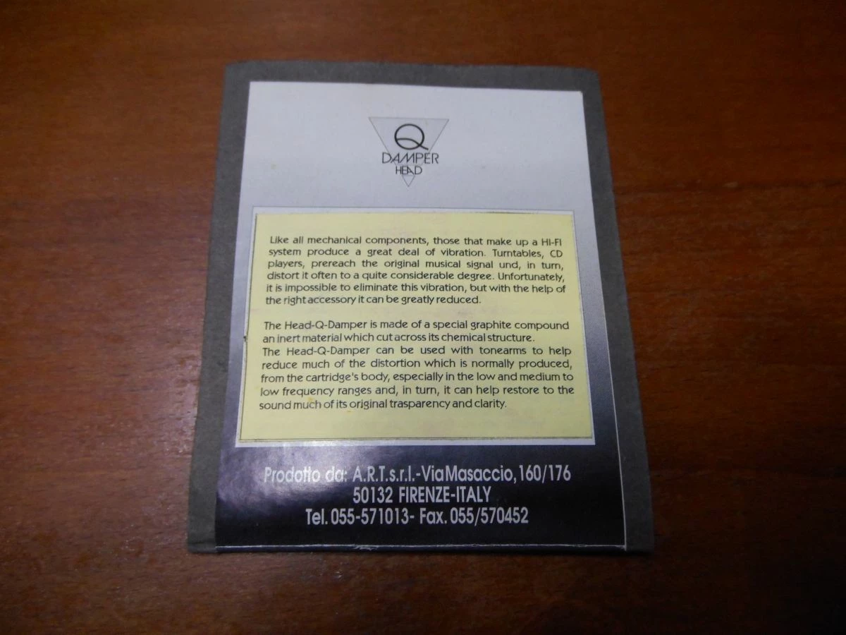 Πωλειτε το βελτιωτικο Αξεσουαρ κεφαλης πικαπ ART Q – DAMPER. εδω παραθετω τα χαρακτηριστικα του..The Head-Q-Damper is made of a special graphite compound an inert material which cut across its chemical structure. The Head-Q-Damper can be used with tonearms to help reduce much of the distortion which is normally produced, from the cartridge’s body, especially in the low and medium to low frequency ranges and, in turn, it can help restore to the sound much of its original trasparency and clarity.