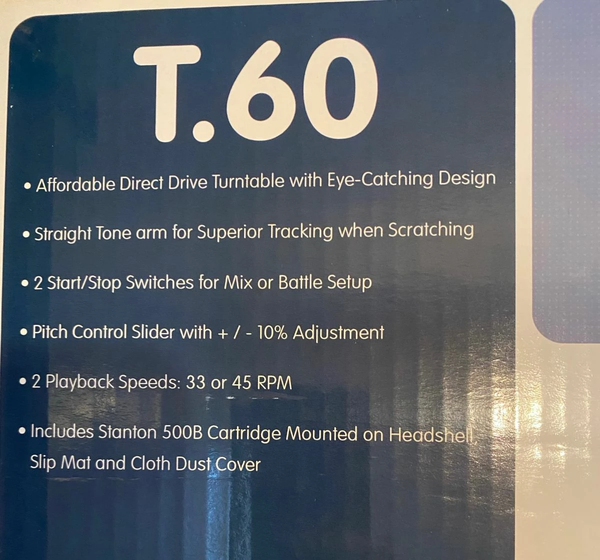Το T.60 Stanton διαθέτει έναν ισχυρό κινητήρα με άφθονη ροπή, βραχίονα ίσιου τόνου ιδανικό για ξύσιμο, καθώς και δύο διακόπτες Start / Stop, ρυθμιστικό ελέγχου βήματος και αφαιρούμενο φως στόχου